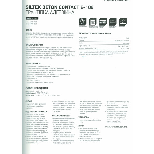 Основні характеристики Ґрунтовка адгезійна Siltek (Сілтек) BETON CONTACT E-106 (5 л)