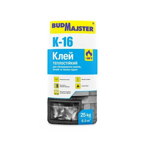 Основні характеристики Клей теплостійкий для облицювання камінів, печей та теплої підлоги BUDMAJSTER (Будмайстер) К-16 25 кг