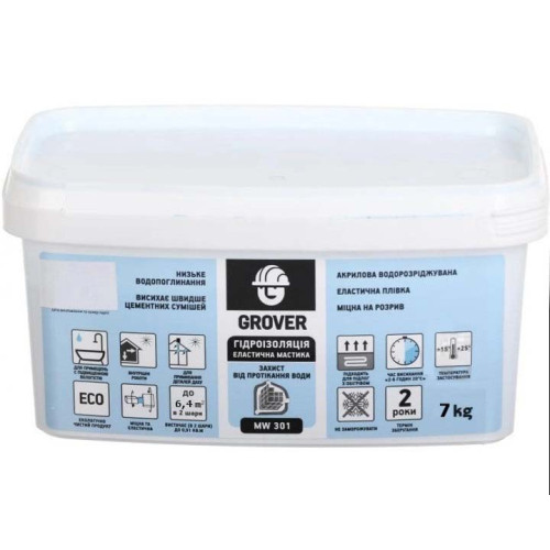 Основні характеристики Гідроізоляційна мастика GROVER (Гровер) MW 301 акрилова 7кг