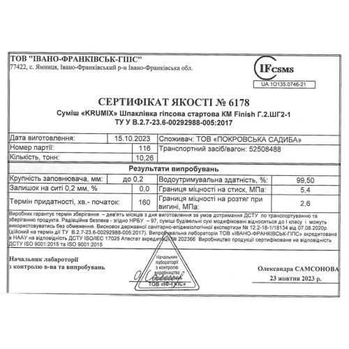 Відгуки про Шпаклівка гіпсова KRUMIX KM Finish фінішна 25кг