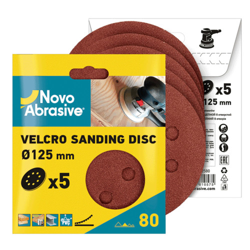 Основні характеристики Коло шліфувальне самозачіпне NovoAbrasive 8 отверстий 125 мм Р180, 5од.