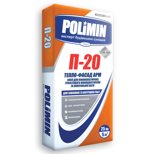 Опис Клей для кріплення та армування пінополістирольних та мінераловатних плит Polimin (Полімін) П-20 25 кг